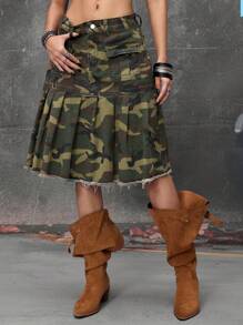 Grunge Punk Women's Streetwear Camouflage Print Flap Pocket Pleated Hem Cargo Denim Mini Skirt