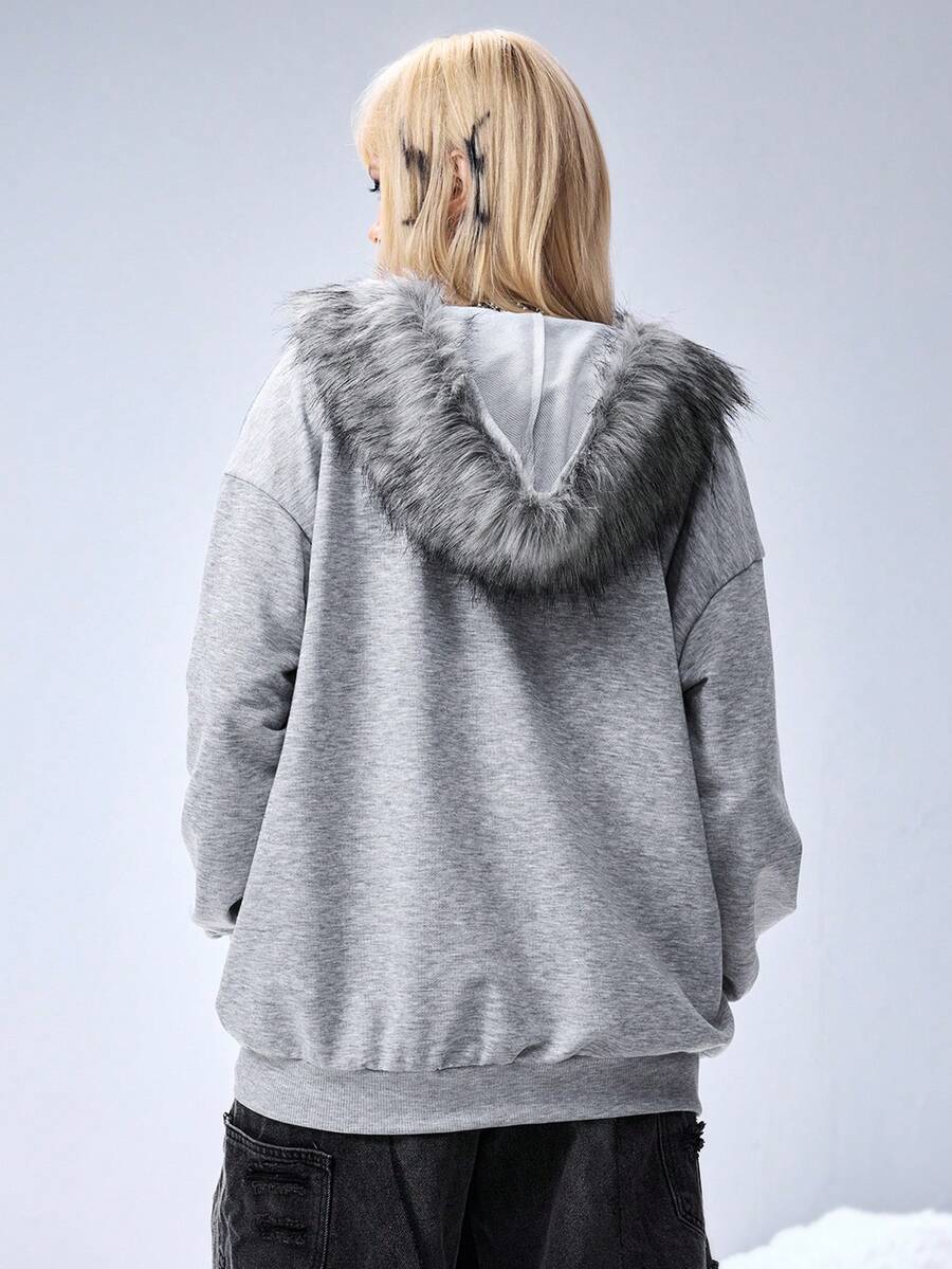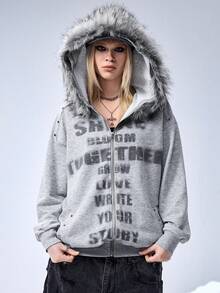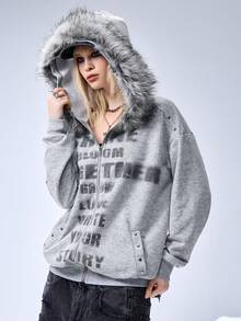 Grunge Punk Women's Y2K Millennium Vintage PUNK English Slogan Print Patchwork Faux Fur Collar Hoodie