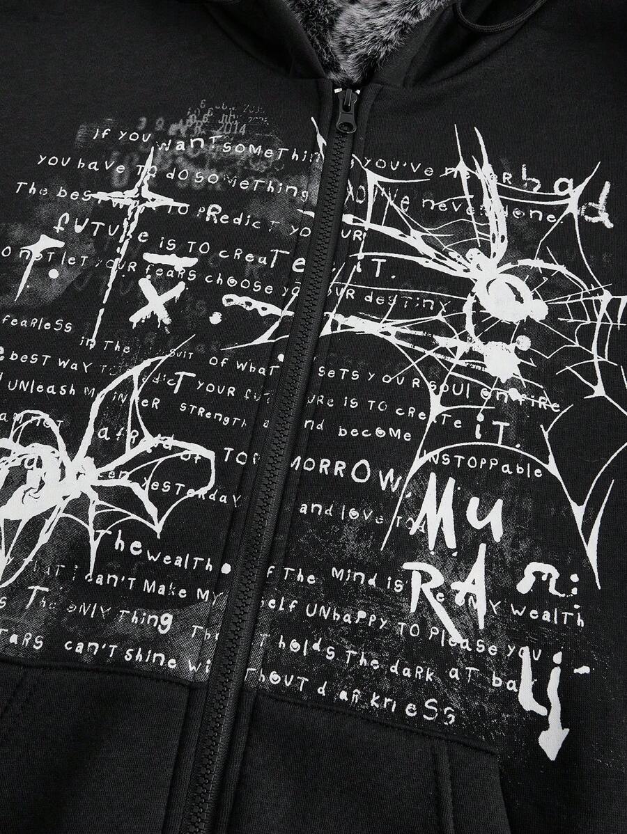 Grunge Punk Women's Y2K Streetwear Spider Slogan Print Patchwork Fluffy Collar Oversized Zip-Up Hoodie