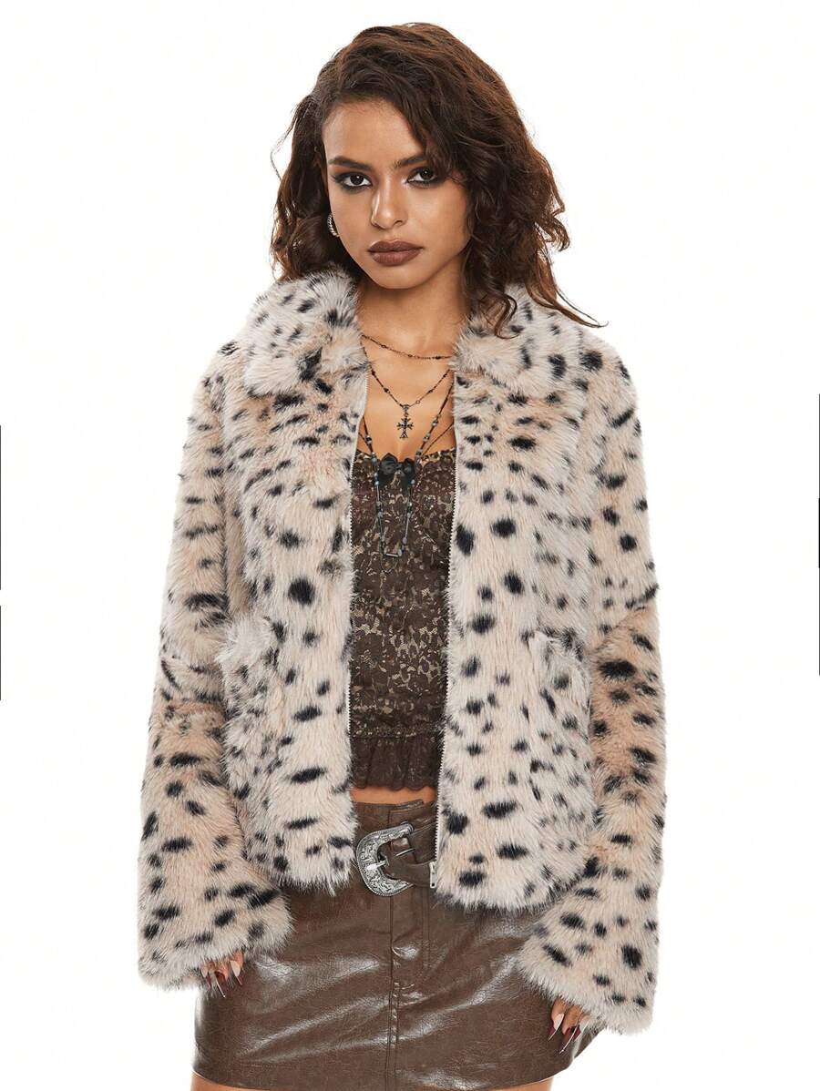 Grunge Punk Y2K Chic Leopard Print Fuzzy Cropped Jacket, Casual Street Style Snow Outfit