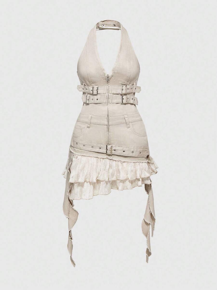 Grunge Punk Y2K Distressed Design Ruffle Tie-Up Patchwork Women's Halter Neck Denim Dress
