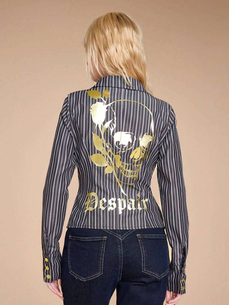 Grunge Punk Y2K Harajuku Baddie Skeleton Slogan Foil Print Striped V-Neck Cinched Shirt