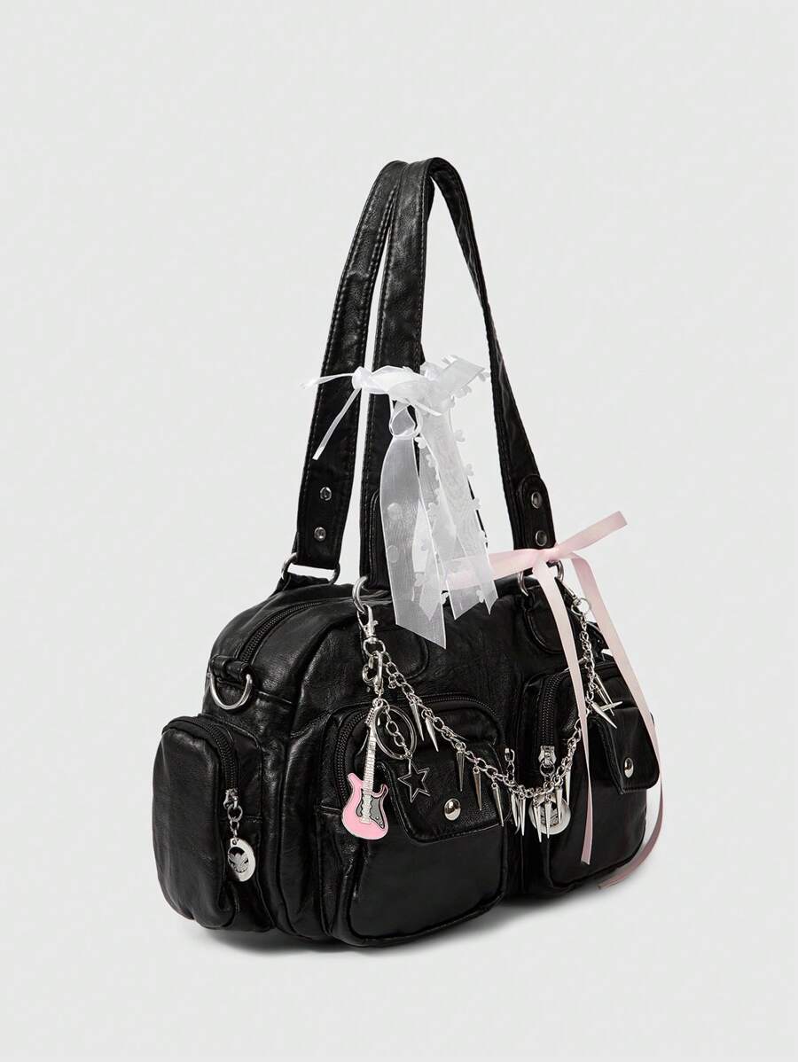 Grunge Punk Y2K Punk Style Pearl Heart Lace Bow Decor Shoulder Bag, Stars Guitar Pendant, Metal Stud Chain Multi-Pocket Tote Bag In Solid Black, Adjustable Strap For Crossbody, Handbag For Music Festivals, Daily Use