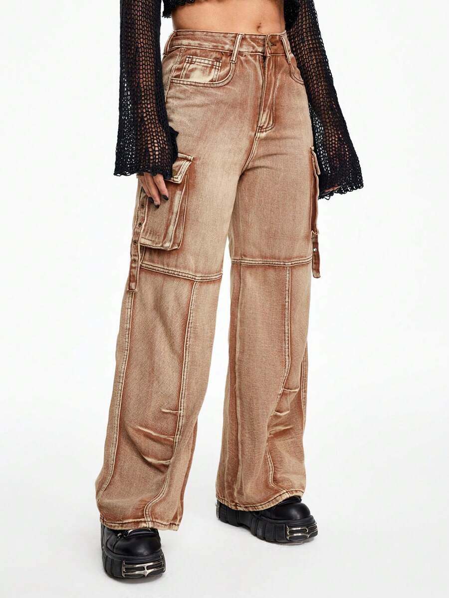 Grunge Punk Y2K Retro Distressed Flap Pocket Washed Rust Colored Loose Straight Low-Waist Jeans