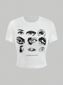 Grunge Punk Y2K Retro Eye Print Round Neck Fitted Waist T-Shirt