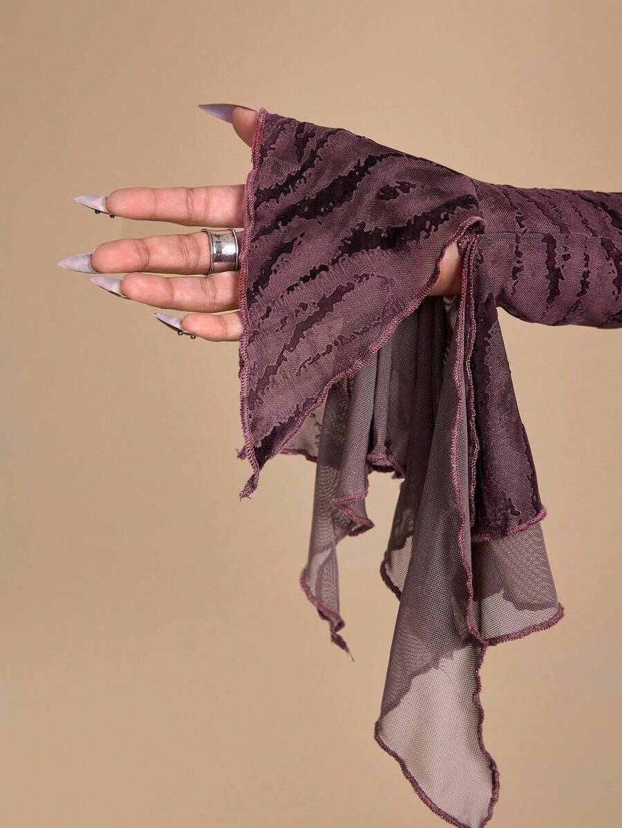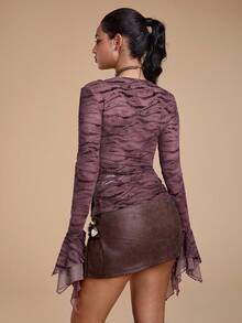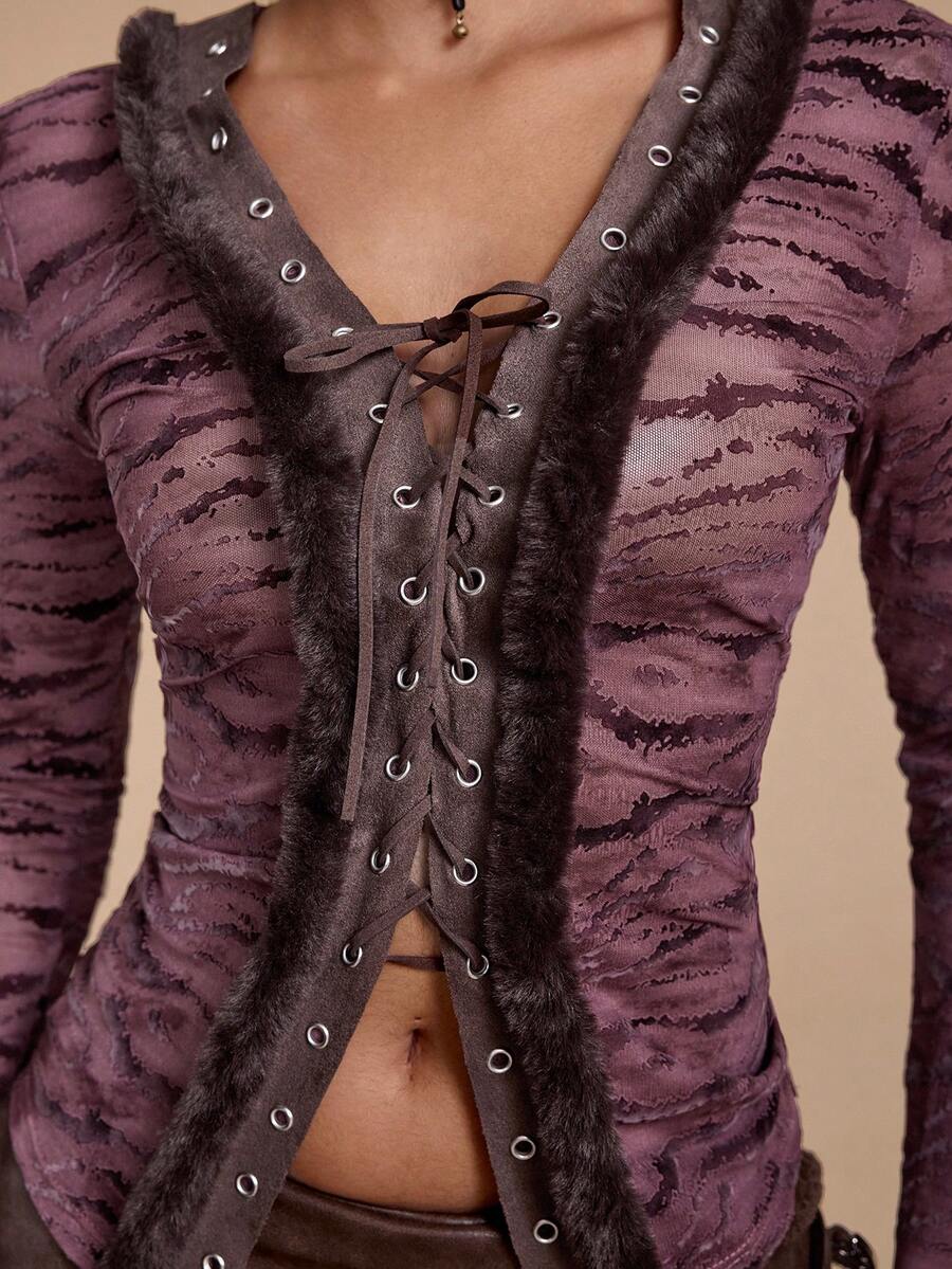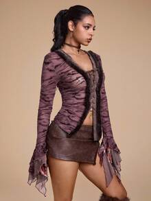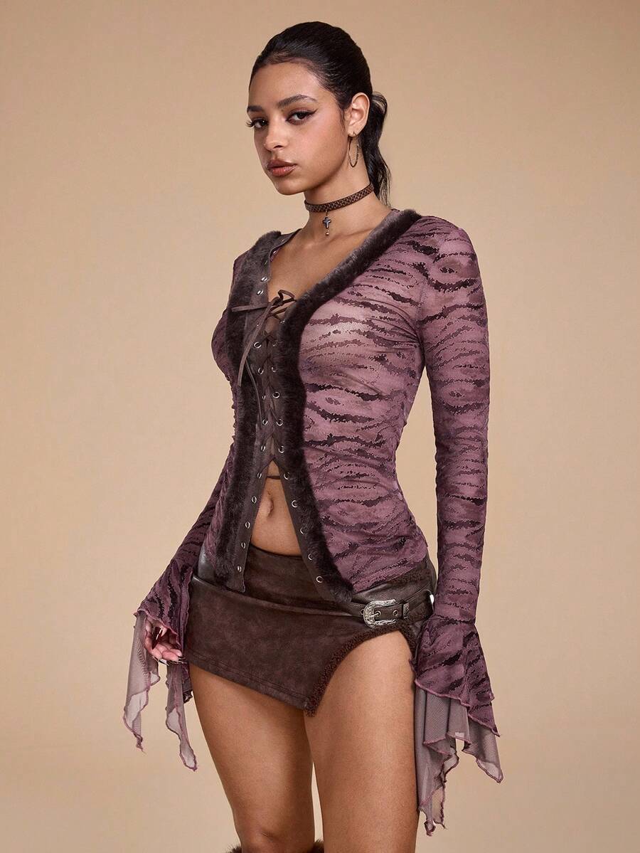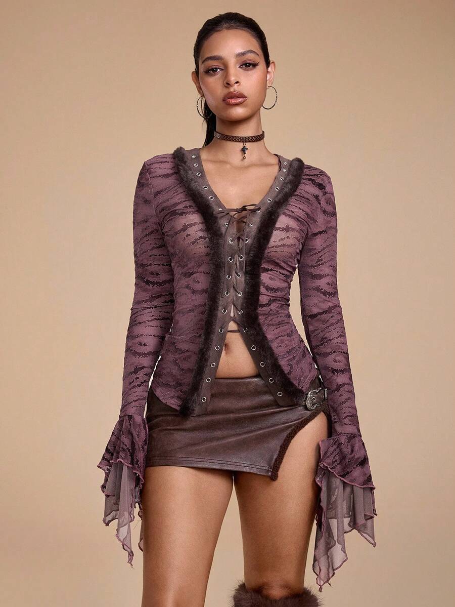 Grunge Punk Y2K Retro Sexy Flocked Patchwork Furry Tie-Up Design Cropped Flare Sleeve Fitted Top