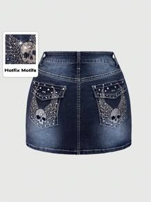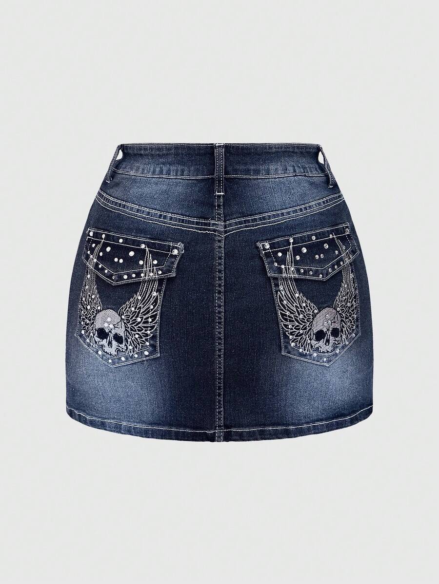Grunge Punk Y2K Retro Skeleton Wings Rhinestone Decor Pocket Mini Denim Skirt For Women, Tight Fit