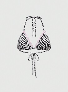 Grunge Punk Y2K Sexy Streetwear Zebra Stripe Patchwork Pink Lace Trim Allover Print Contrasting Design Bikini Top
