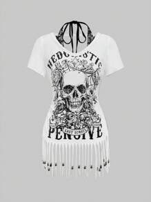 Grunge Punk Y2K Style Goth, Gothic Skull Print 2 In 1 Tasseled Hem Retro T-Shirt For Halloween