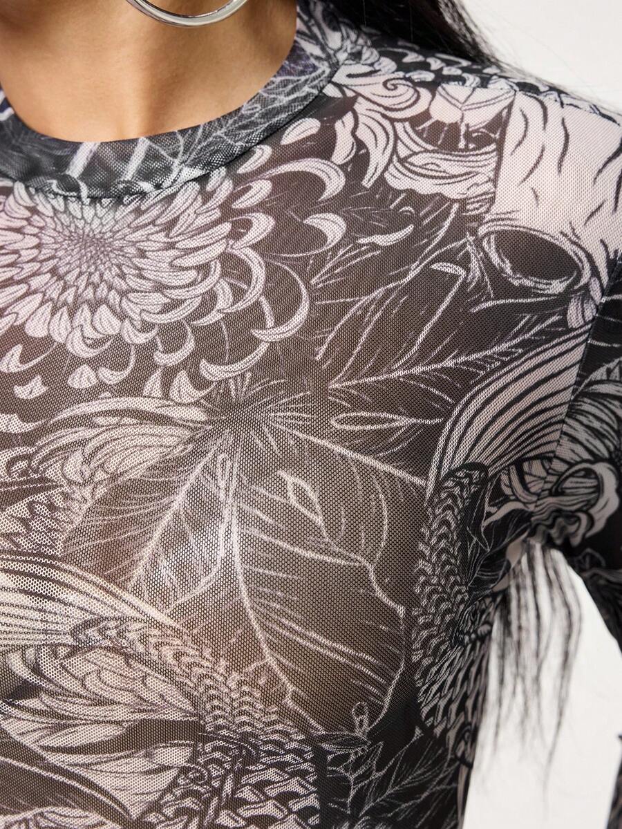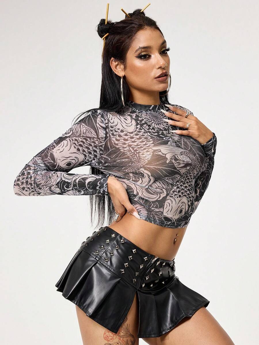 Grunge Punk Y2K Style Sexy Tight Mesh Top With Carp Fish Scale All-Over Print