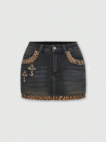 Grunge Punk Y2K Subculture Retro Sexy Leopard Patchwork Women Denim Mini Skirt