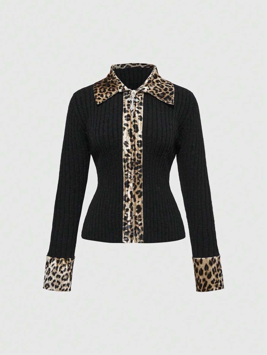 Grunge Punk Y2K Vintage Sexy Leopard Print Patchwork Collared Knit Cardigan For Women