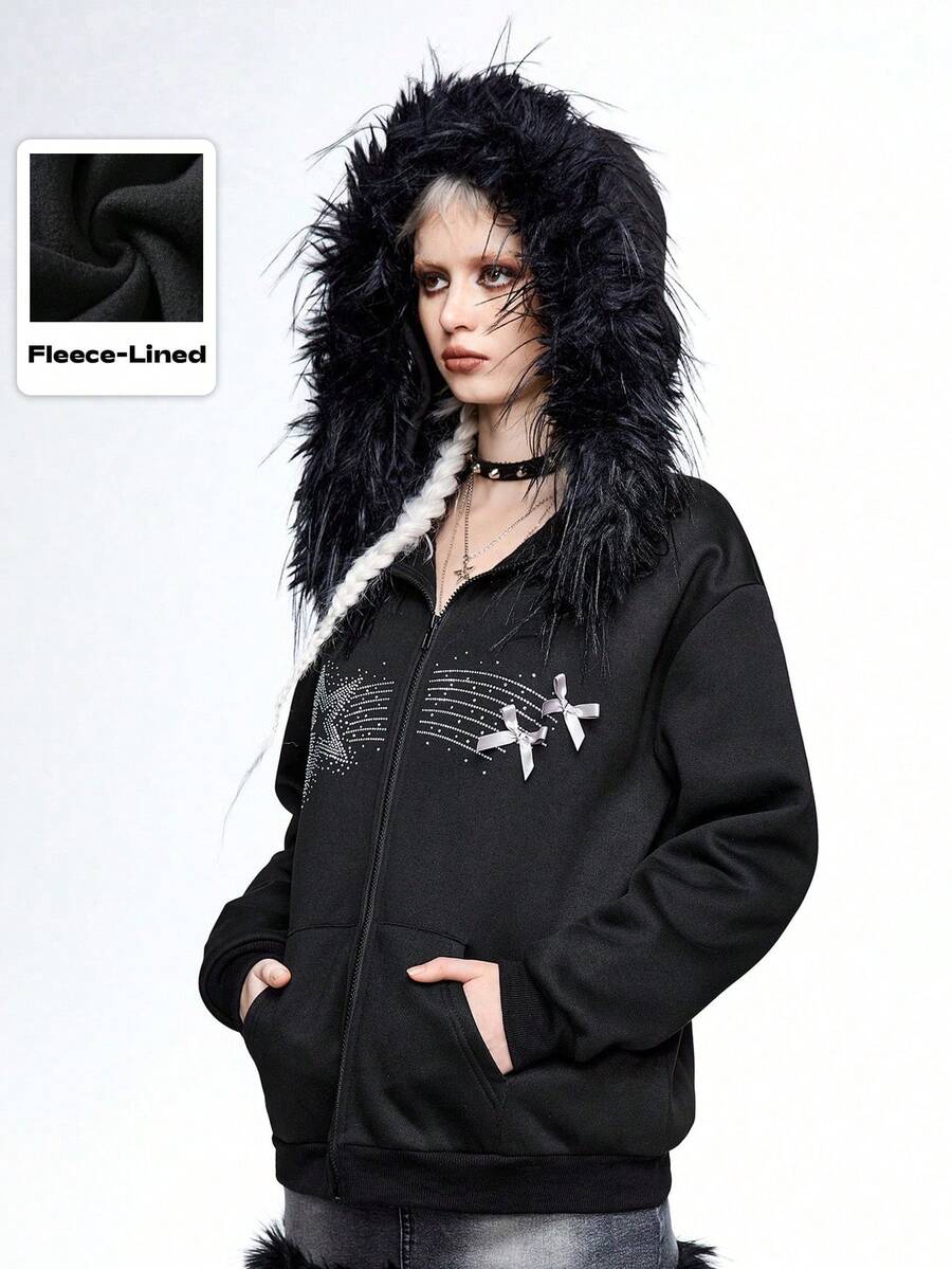 Grunge Punk Y2K Vintage Sexy Star Rhinestone Bow Oversized Hooded Fleece Sweatshirt For Women