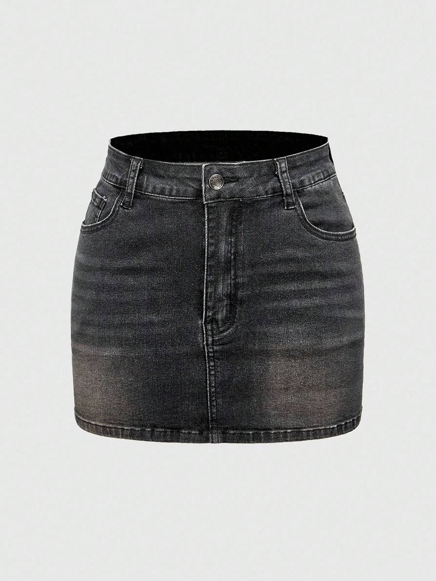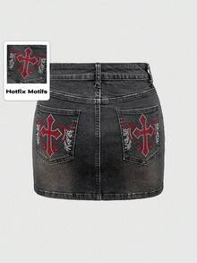 Grunge Punk Y2K Vintage Women Tight Cross Wing Rhinestone Decor Pocket Mini Denim Skirt