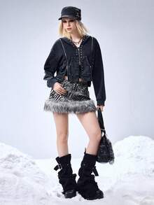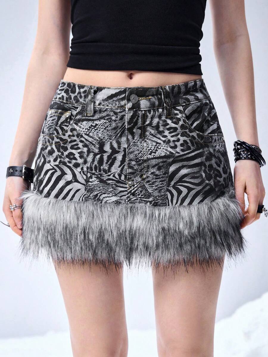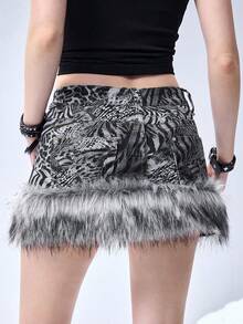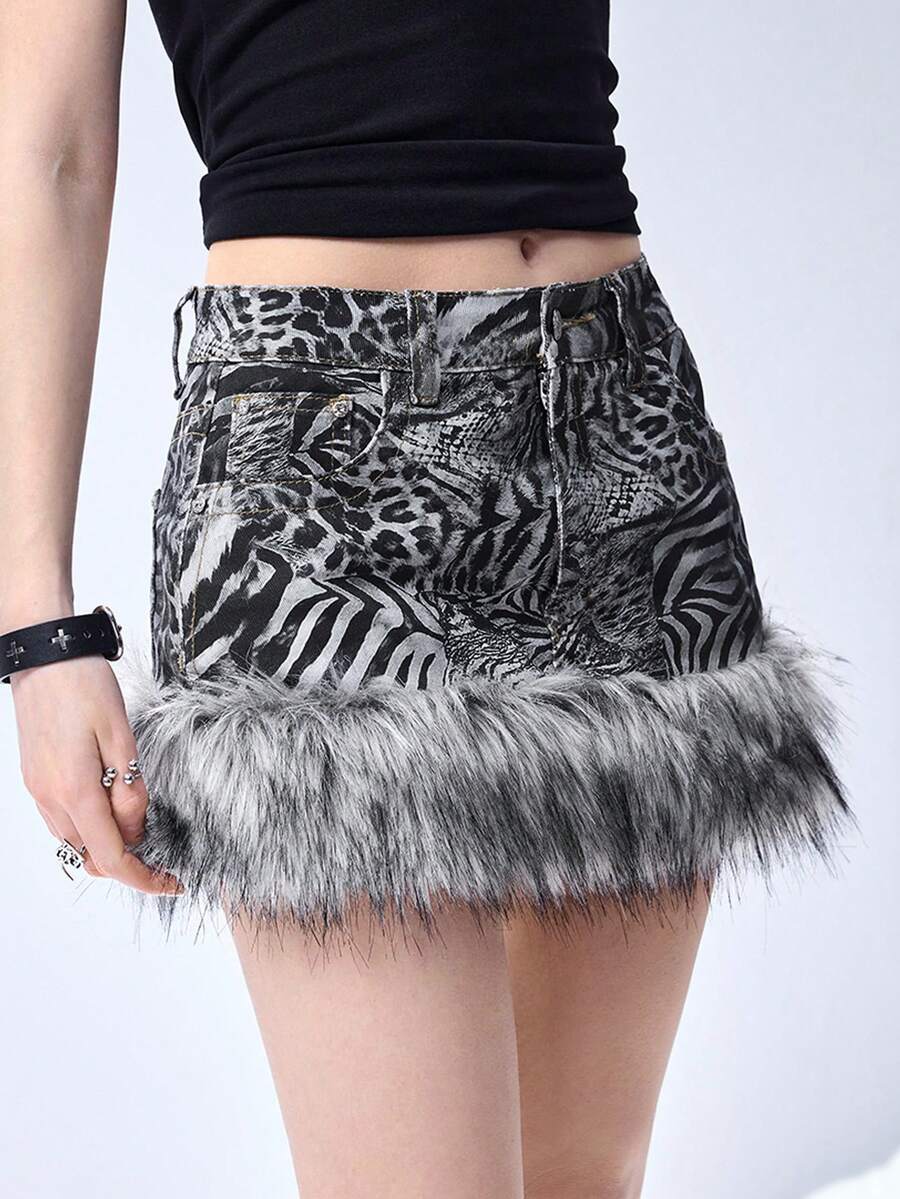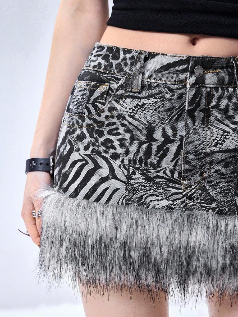 Grunge Punk Y2K Vintage Zebra & Leopard Print Patchwork Fuzzy Super Low Waist Super Short Denim Mini Skirt