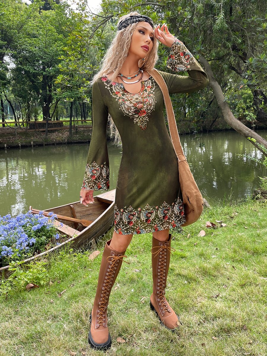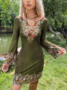 Grunge Tie Dye Floral Print Trumpet Sleeve Dress