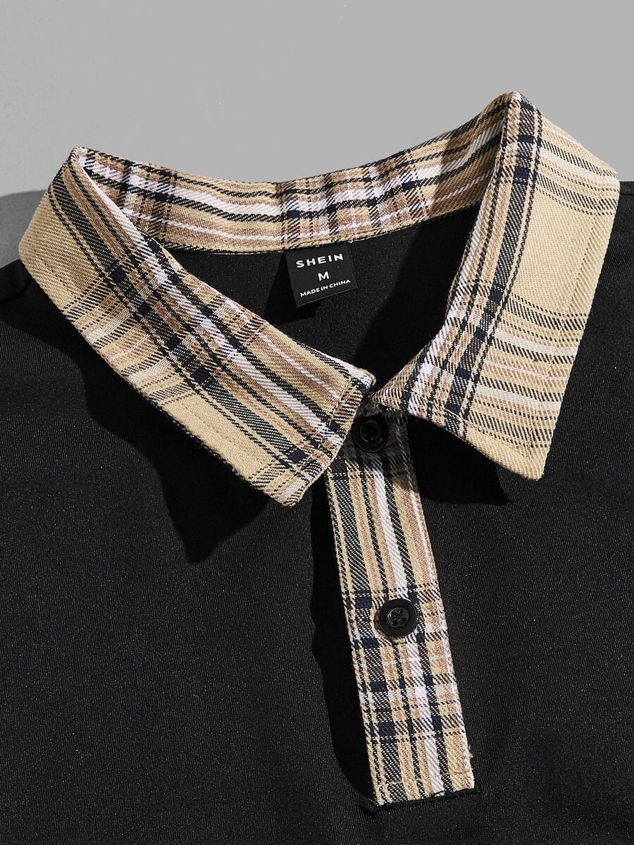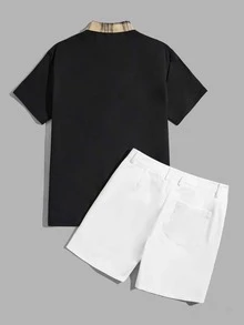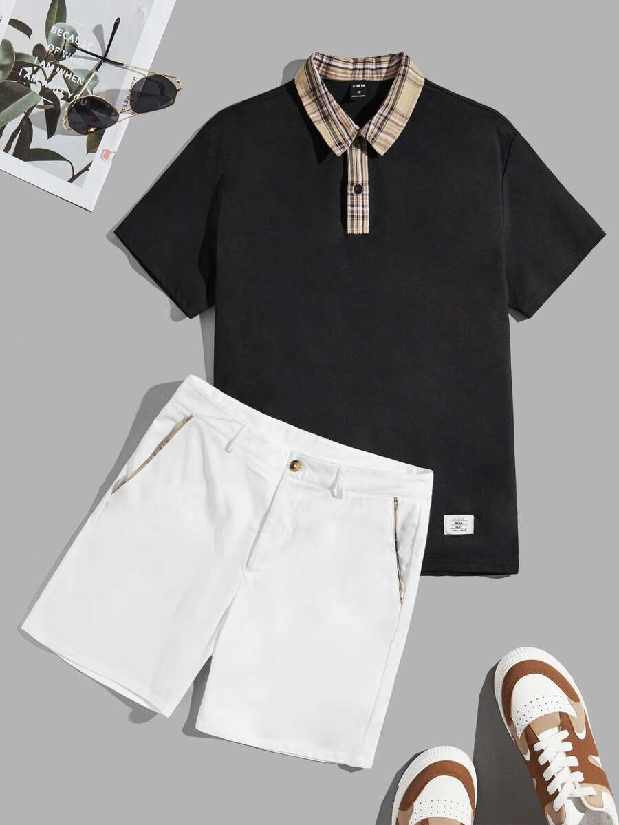 Guys Contrast Plaid Collar Polo Shirt & Shorts