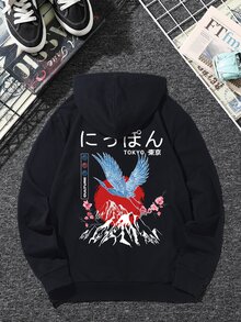 Guys Crane And Japanese Letter Graphic Thermal Hoodie