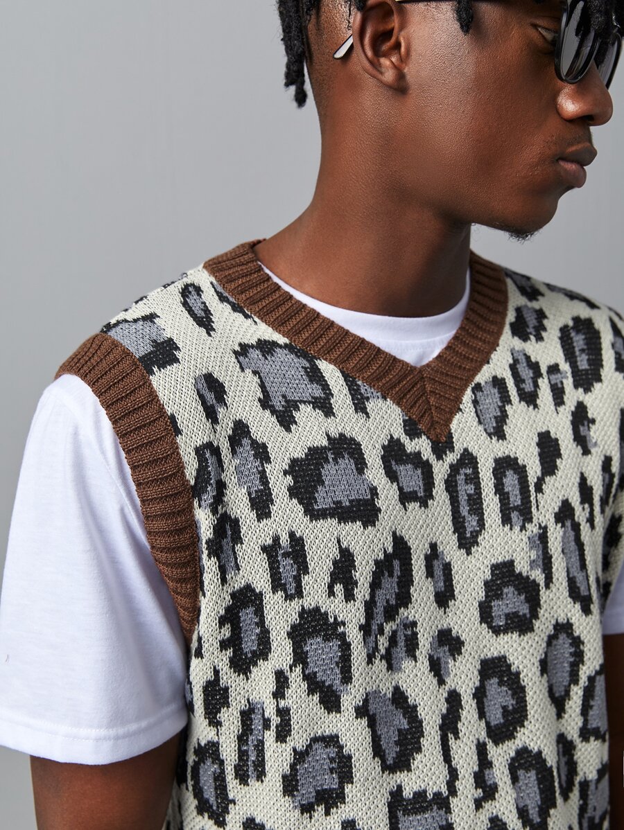 Guys Leopard Pattern Contrast Binding Sweater Vest