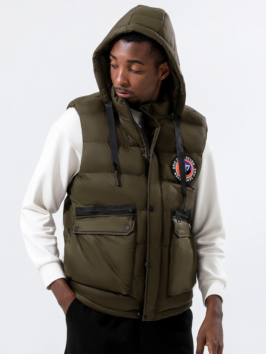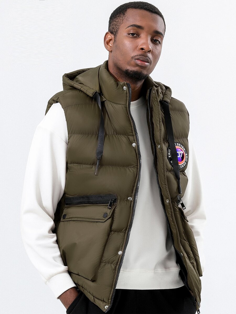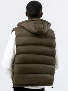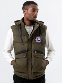 Guys Patch Detail Flap Pocket Drawstring Hooded Puffer Vest Coat