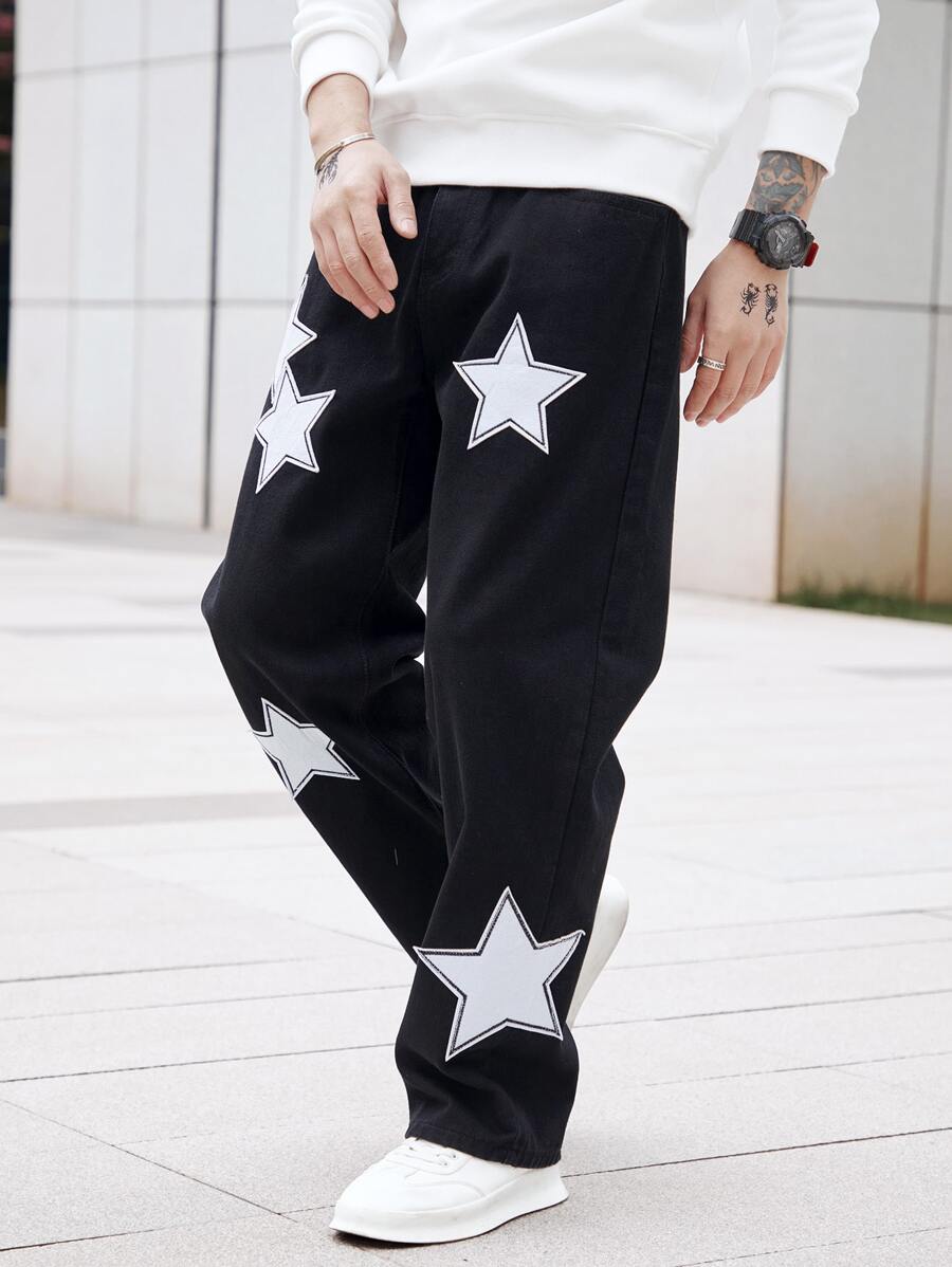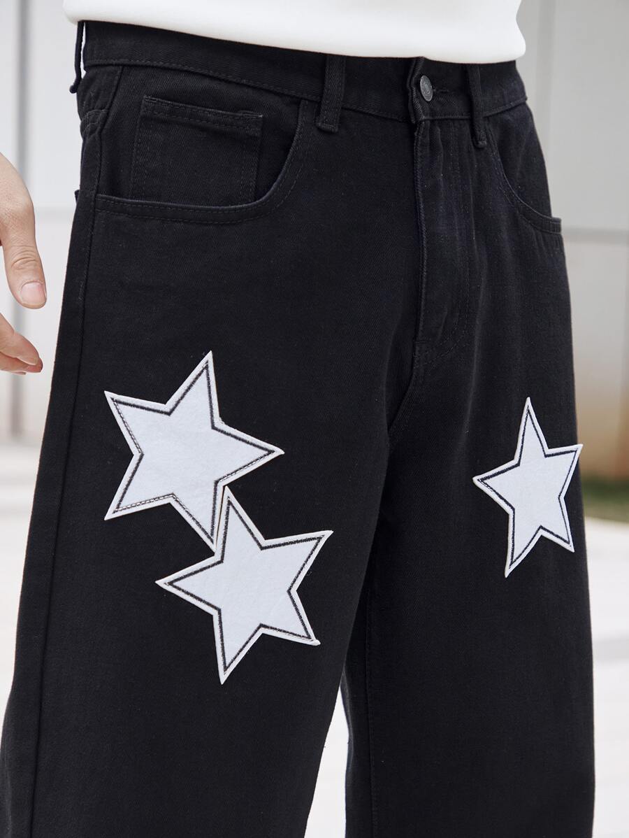 Guys Star Patched Loose Fit Jeans