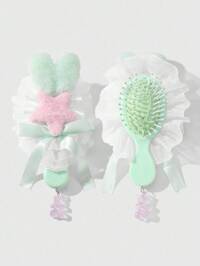 Kawaii 1pc Cute Cartoon Mini Delicate Fashion Pink & White Mesh Ribbon Bow Resin Glitter Star Massage Hair Comb, Suitable For Women/Girls Daily Use, Holiday Gift