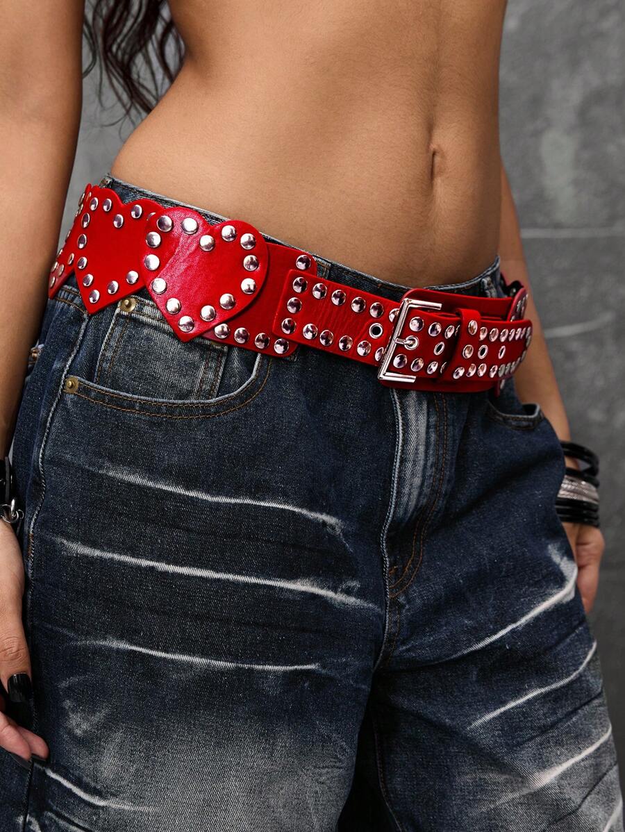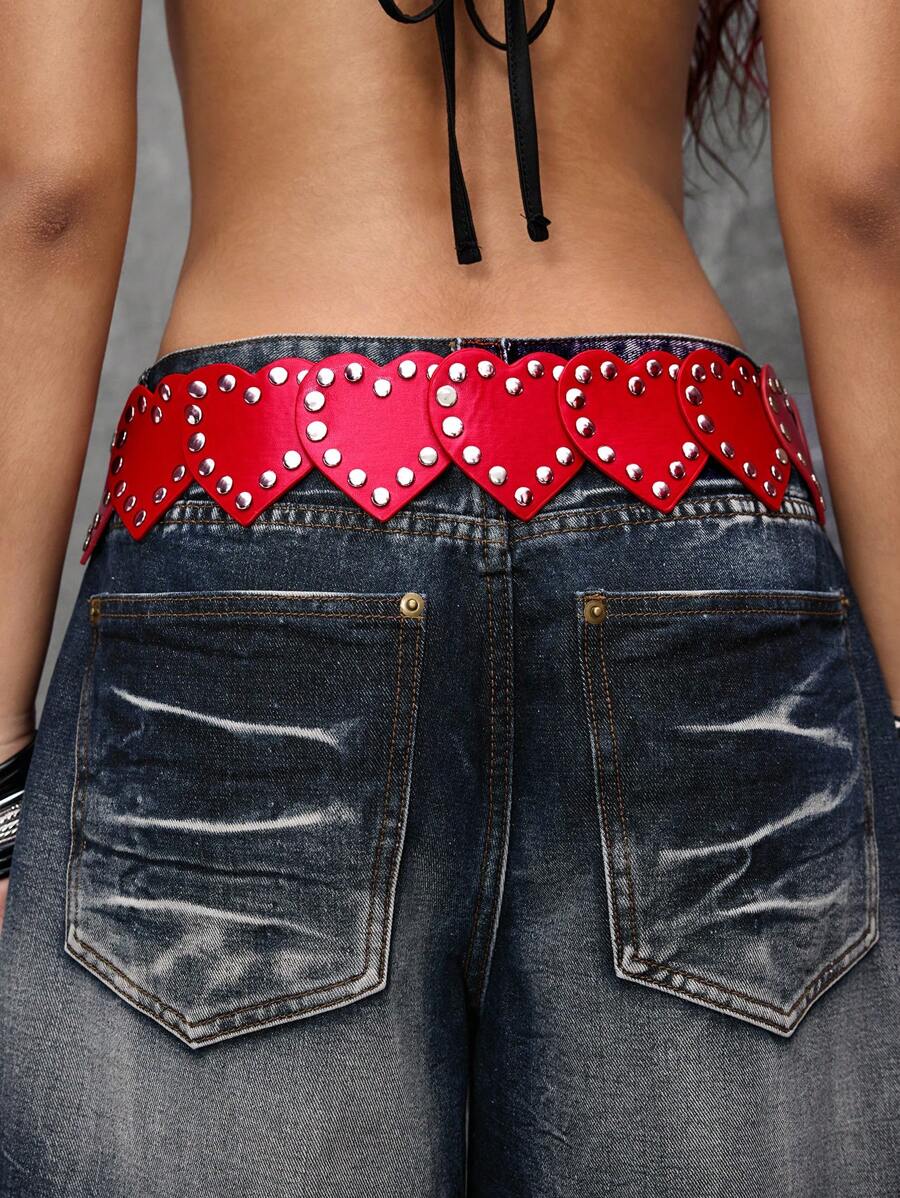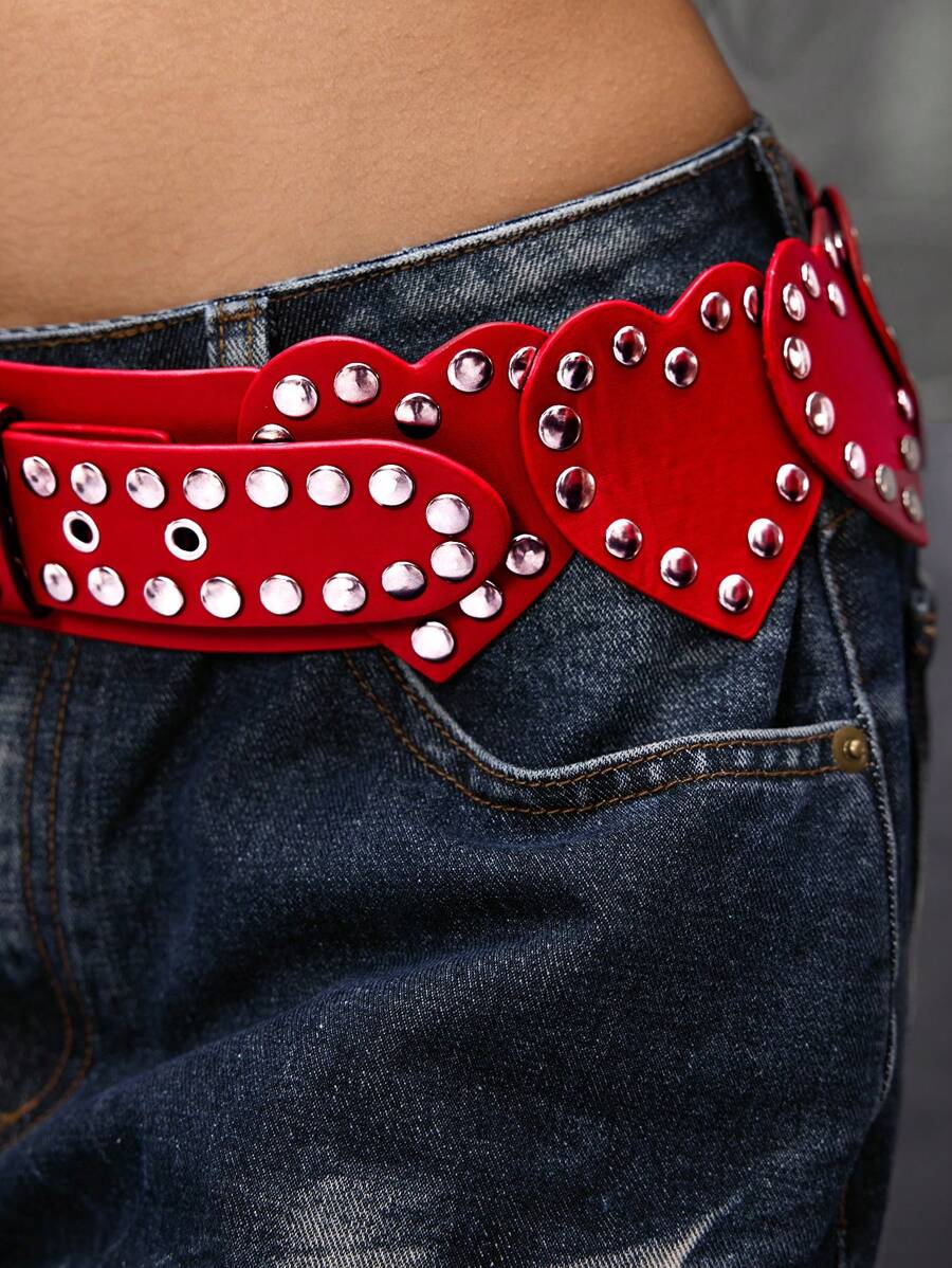 Hippie 1pc Women's Red Rivet Heart Decor Western Punk Style Heart Wide Belt For Dress Jeans Everyday Versatile Accessory