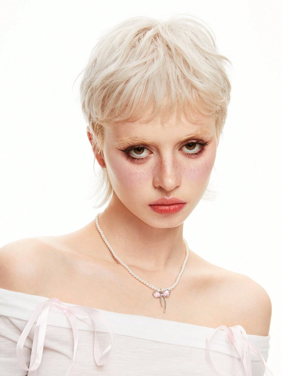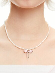 Hippie Fashionable Creative Pink Bowknot Pendant Pearl Necklace