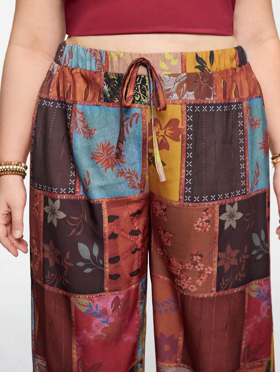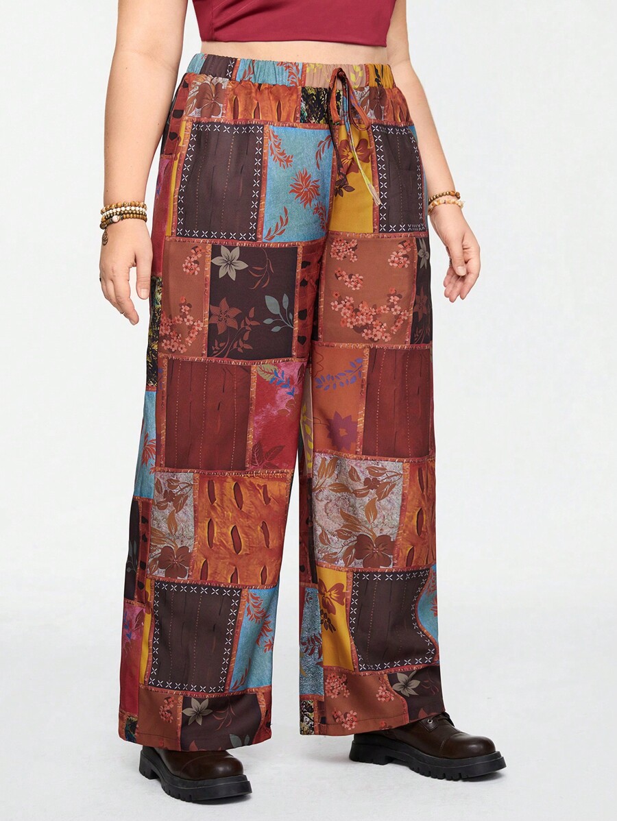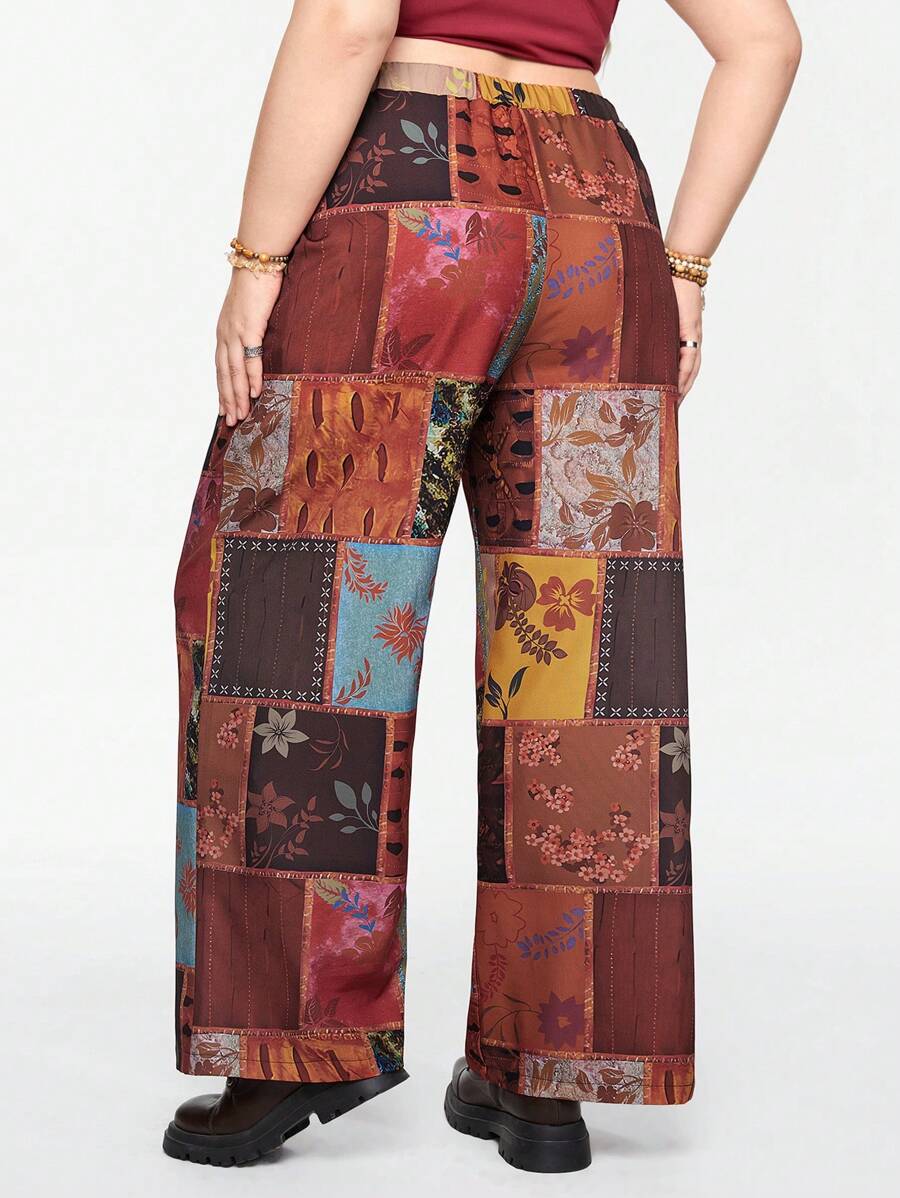 Hippie Plus Size Vintage Square Pattern Printed Wide Leg Pants With Patchwork Design
