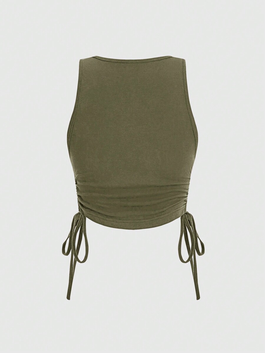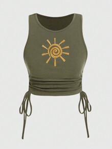 Hippie Plus Size Women's Casual Tank Top With Sun Embroidery And Side Drawstring