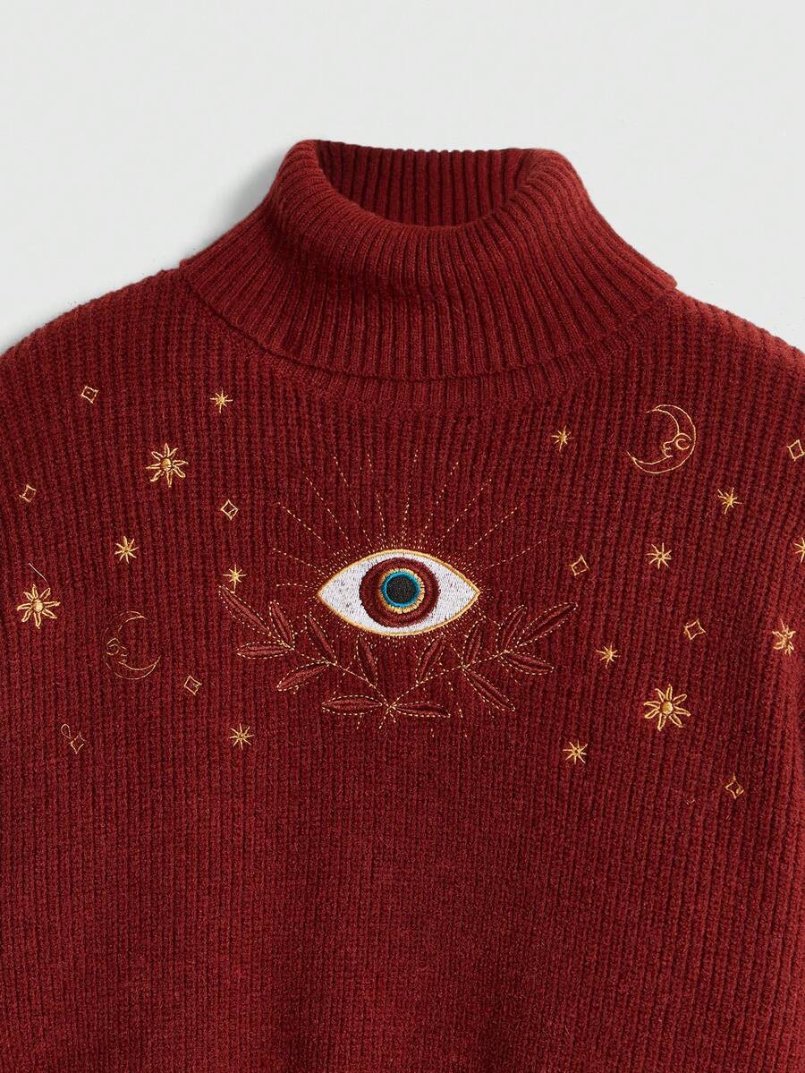 Hippie Retro Boho Vacation Style Moon & Star Embroidery Blue-Green Pullover Sweater