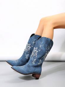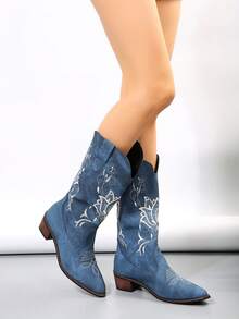 Hippie Women Floral Embroidered Point Toe Chunky Heeled Western Boots, Cool Outdoor Fashion Boots