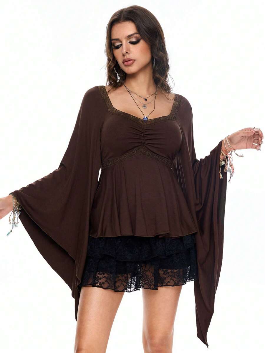 Women's Boho Style Hippie Solid Color Lace Patchwork Oversized Flare Sleeve A-Line T-Shirt