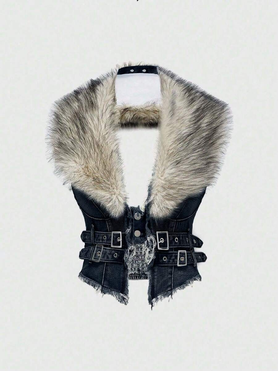 Hippie Y2K Detachable Faux Fur Collar Denim Jacket For Women