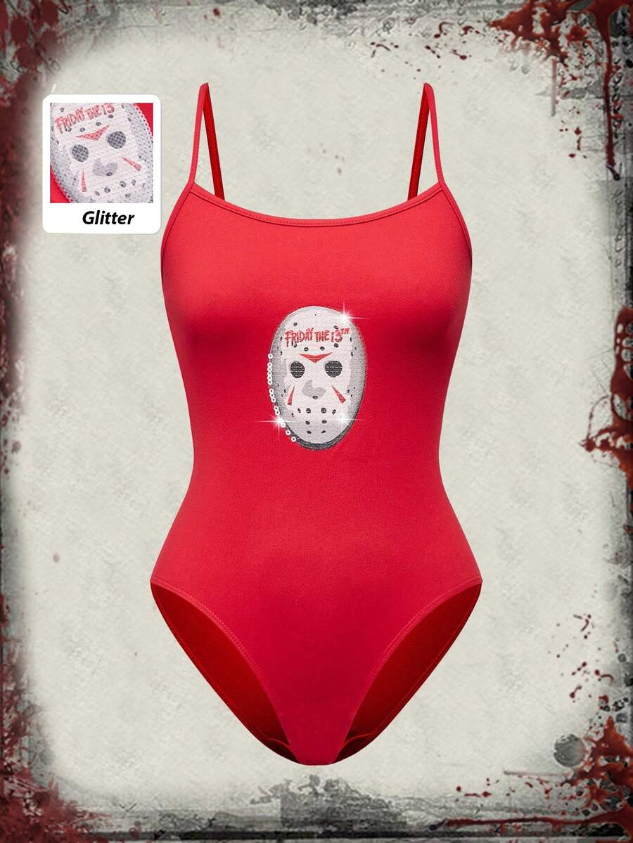 Friday the 13th X ROMWE Horror Movie Sequin Embroidered Sexy Spaghetti Strap Bodysuit For Women