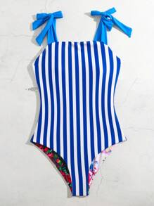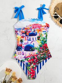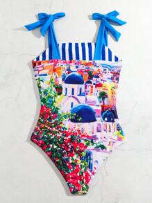 House & Floral Print Tie Shoulder One Piece Swimsuit