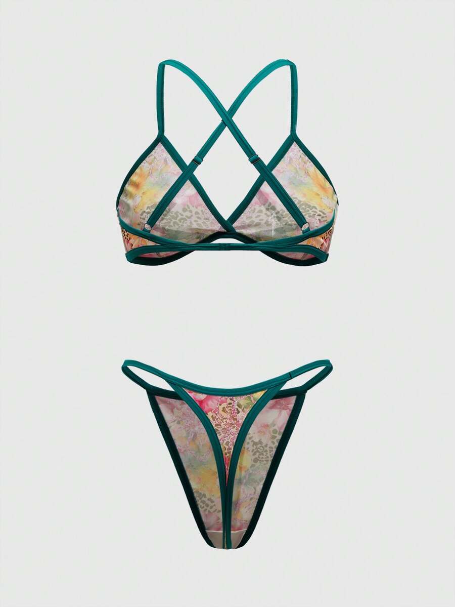 J-Fashion 1pc Island Girl, Hibiscus Flower, Leopard Print Mesh Full Print Wireless Sexy Lingerie Set