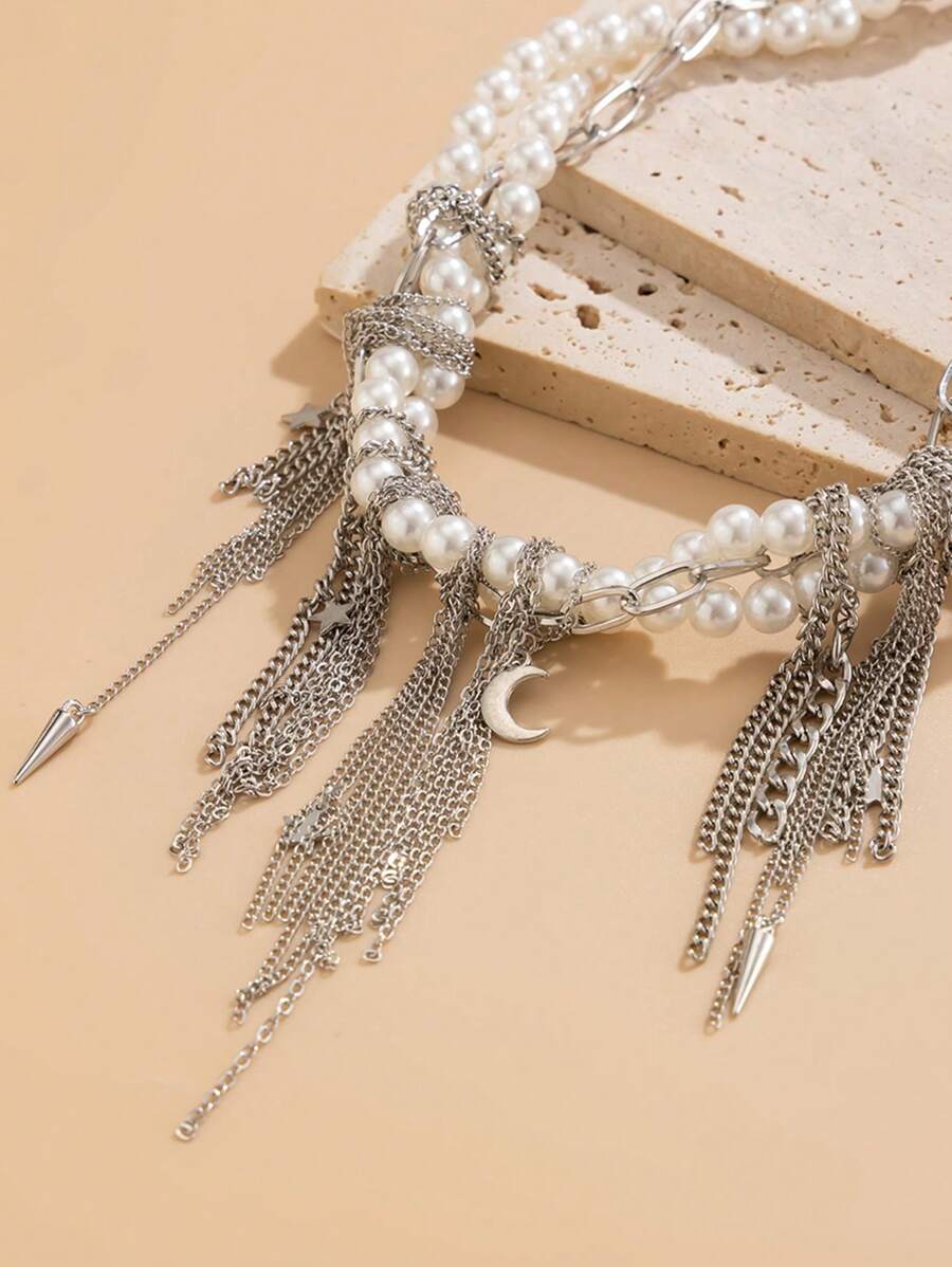 J-Fashion 1pc Women Fashion Multi-Layer Pearl Necklace With Tassel Pendant, French Style Choker