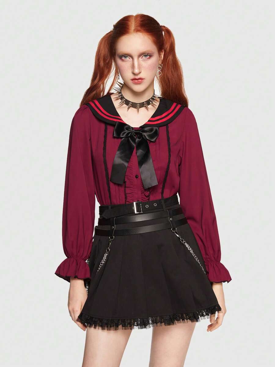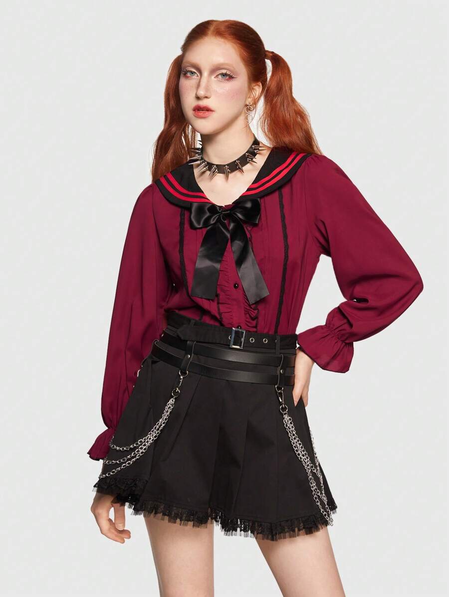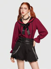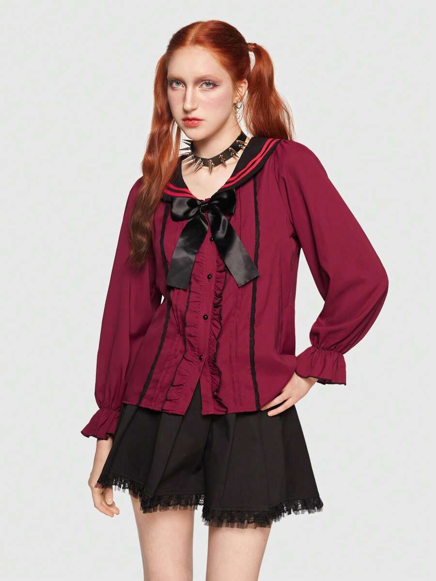 J-Fashion Bow Front Frill Trim Sailor Collar Shirt