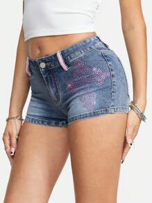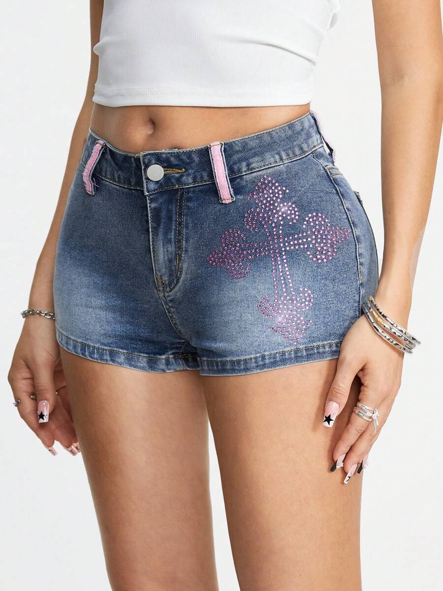 J-Fashion Low Waist Cross & Rhinestone Design Women's Denim Shorts, School