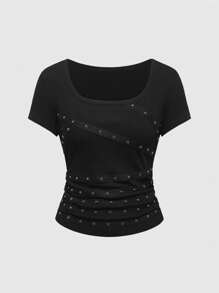 J-Fashion Punk Style Women's Sexy Rivet Backless Low Neck Black T-Shirt, Suitable For Summer Beach, Graduation Ceremony, Easter, Music Concerts, Nashville, Festivals