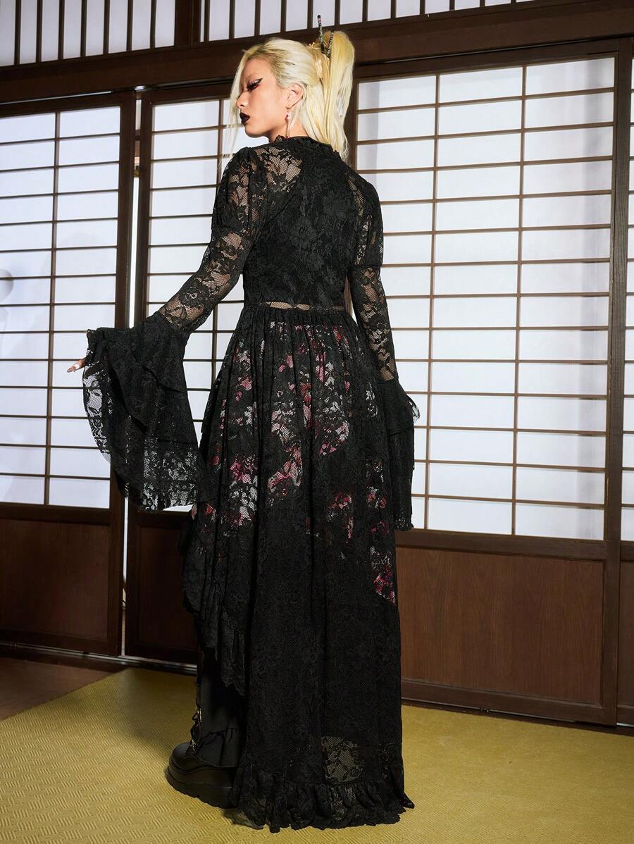 J-Fashion Women's Floral Print Contrast Lace Flare Sleeve Long Dress