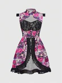 J-Fashion Women's Floral Print Contrast Lace Hollow Out Elegant Short Dress