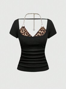 J-Fashion Women's Gyaru Sexy Short Sleeve Leopard Patchwork Tight-Fitting T-Shirt