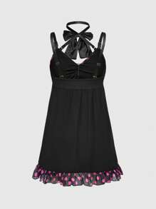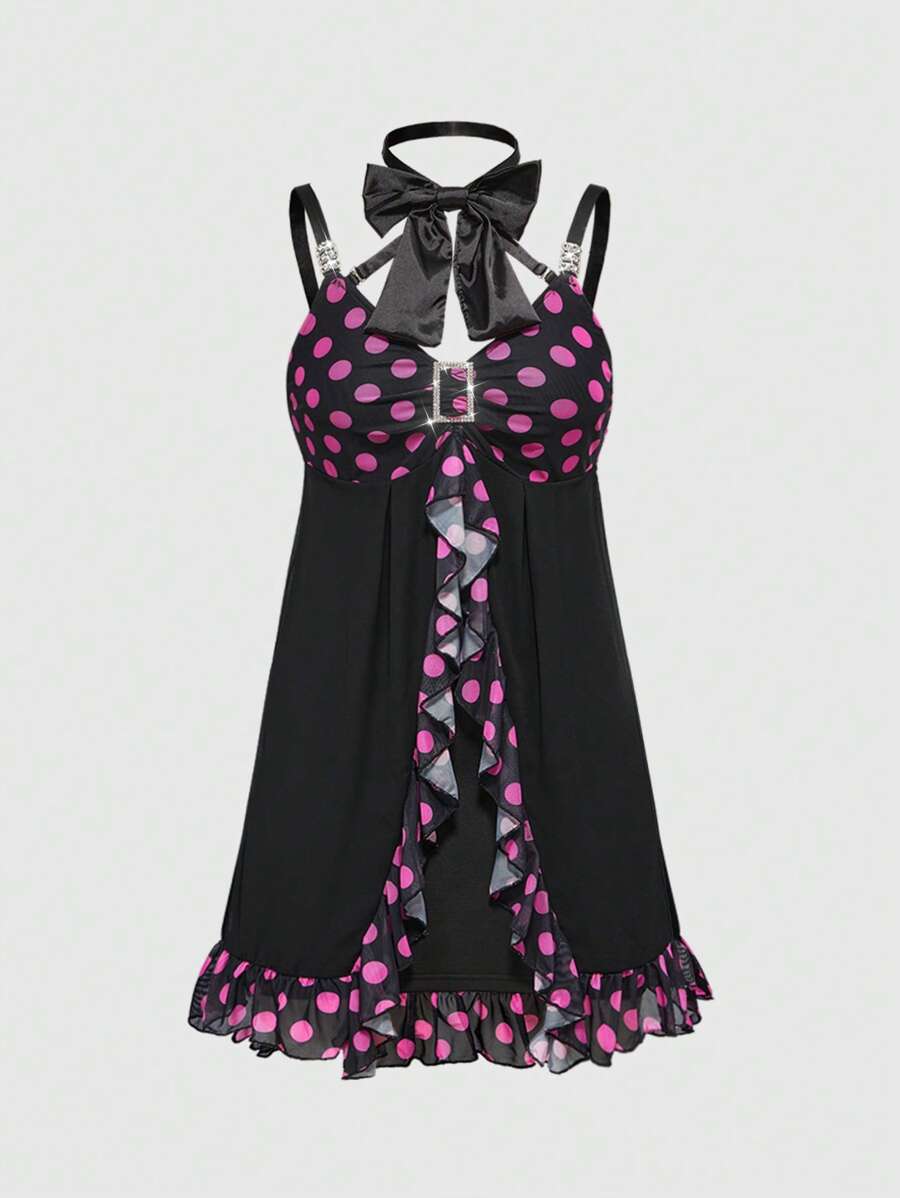 J-Fashion Women's Polka Dot Print Ruffle Hem Spaghetti Strap Bow Tied Neck Mini Dress
