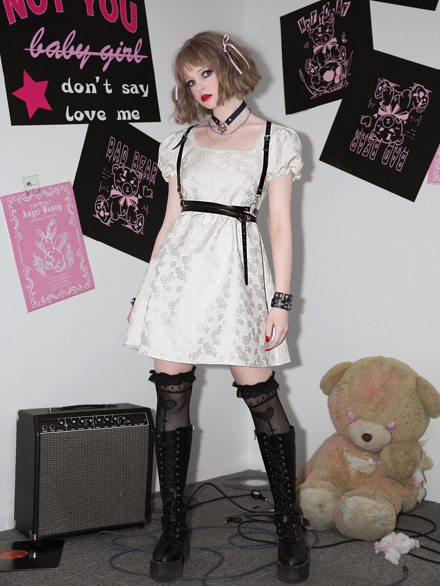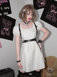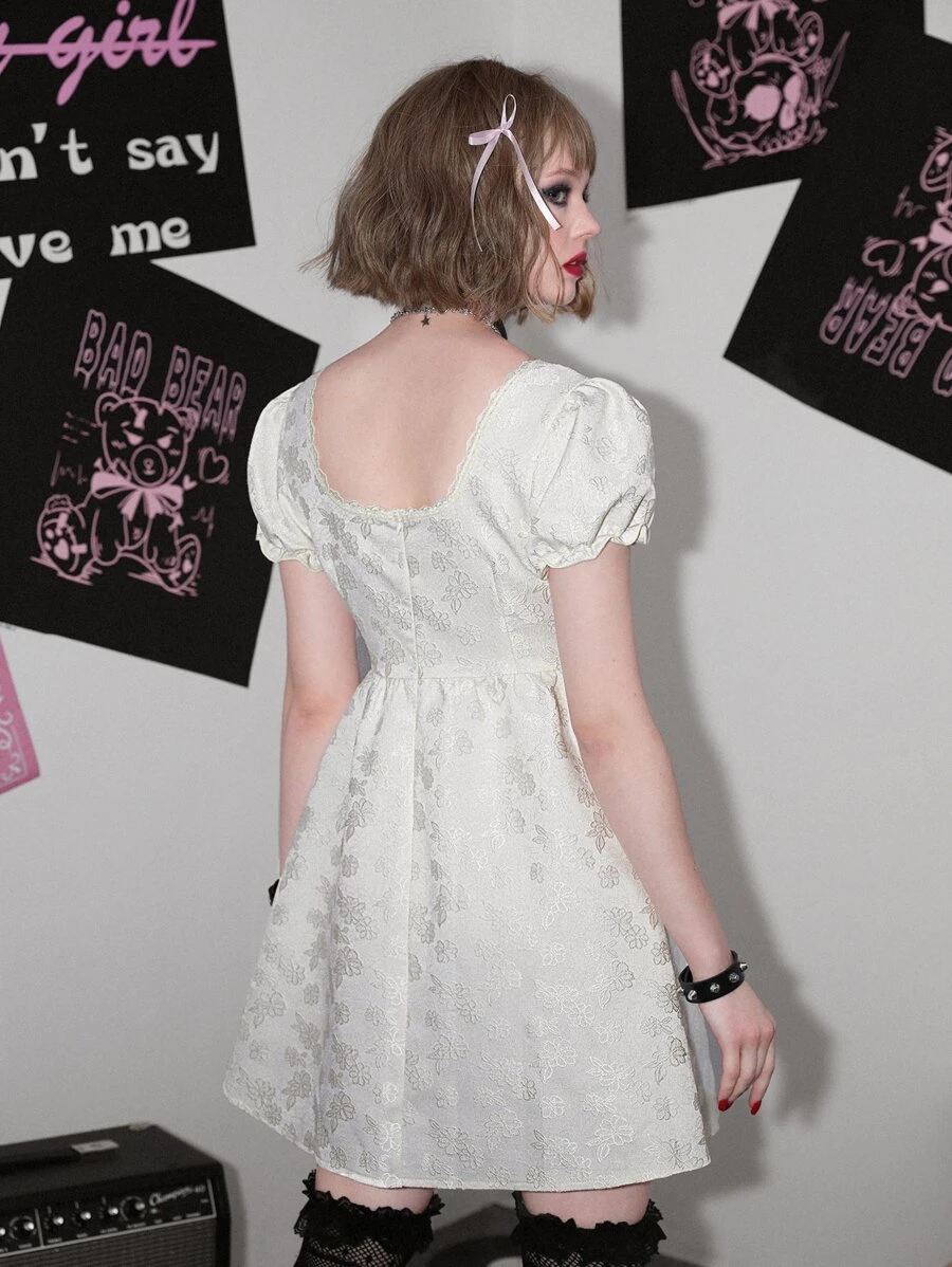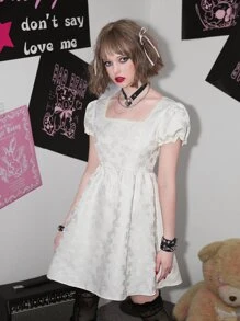 Sweetness Jacquard Square Neck Puff Sleeve Dress Without Belt