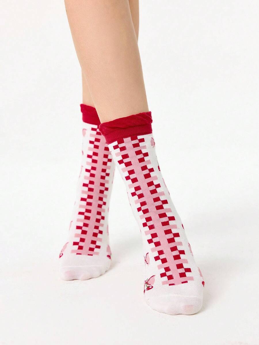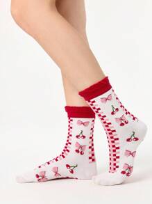 1 Pair Cute Kawaii Cherry Pink Bow Lace Edge Mid-Calf Socks