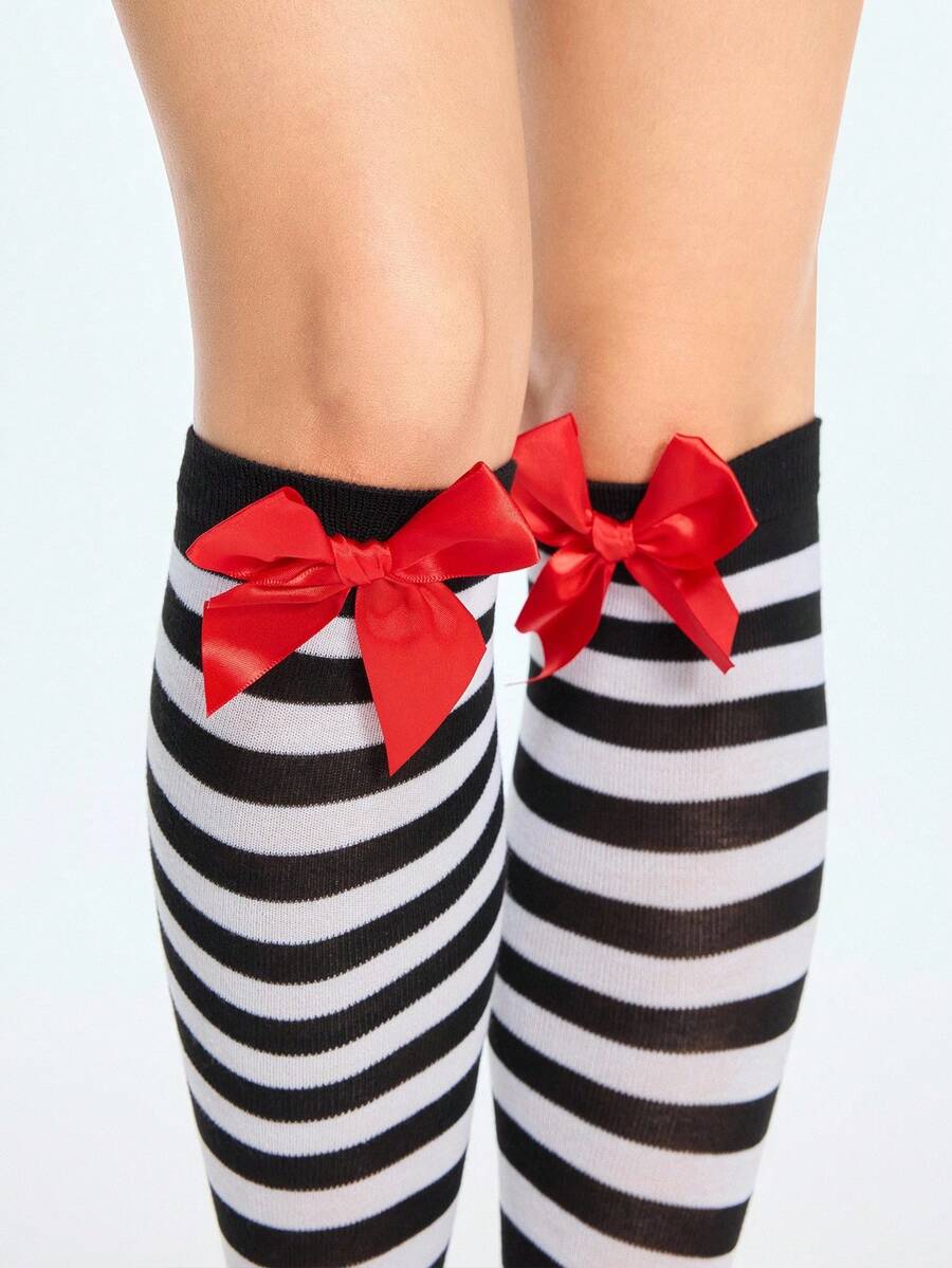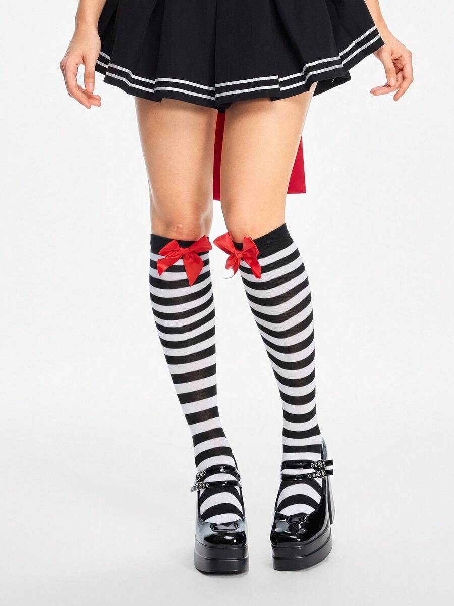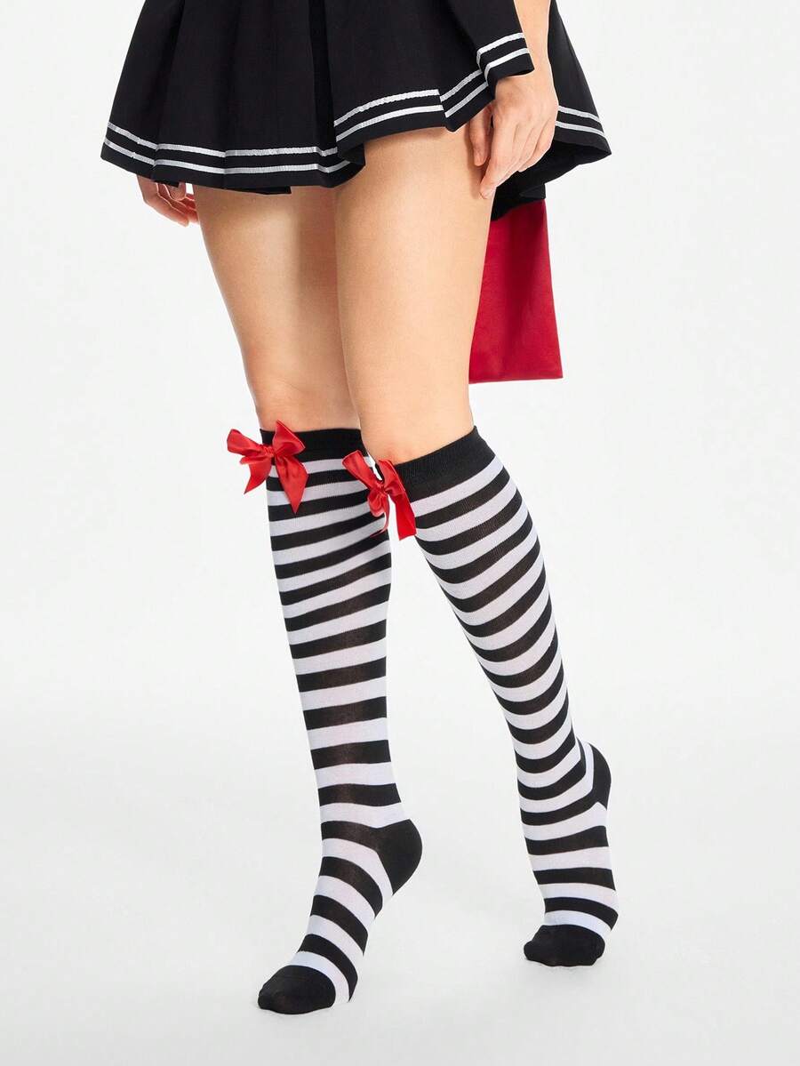Kawaii 1 Pair Fashionable Holiday Attire Black & White Striped Big Bow Decor Women Mid-Calf Socks