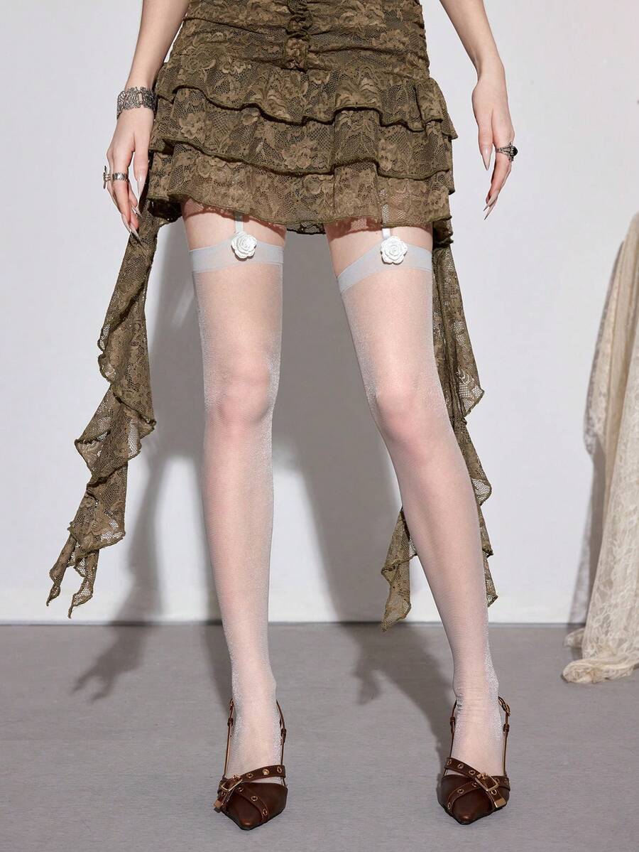 Kawaii 1 Pair Goth Glam Silver Pearl Lace Trim Over-The-Knee Thigh High Stockings With Luminous Floral Decor