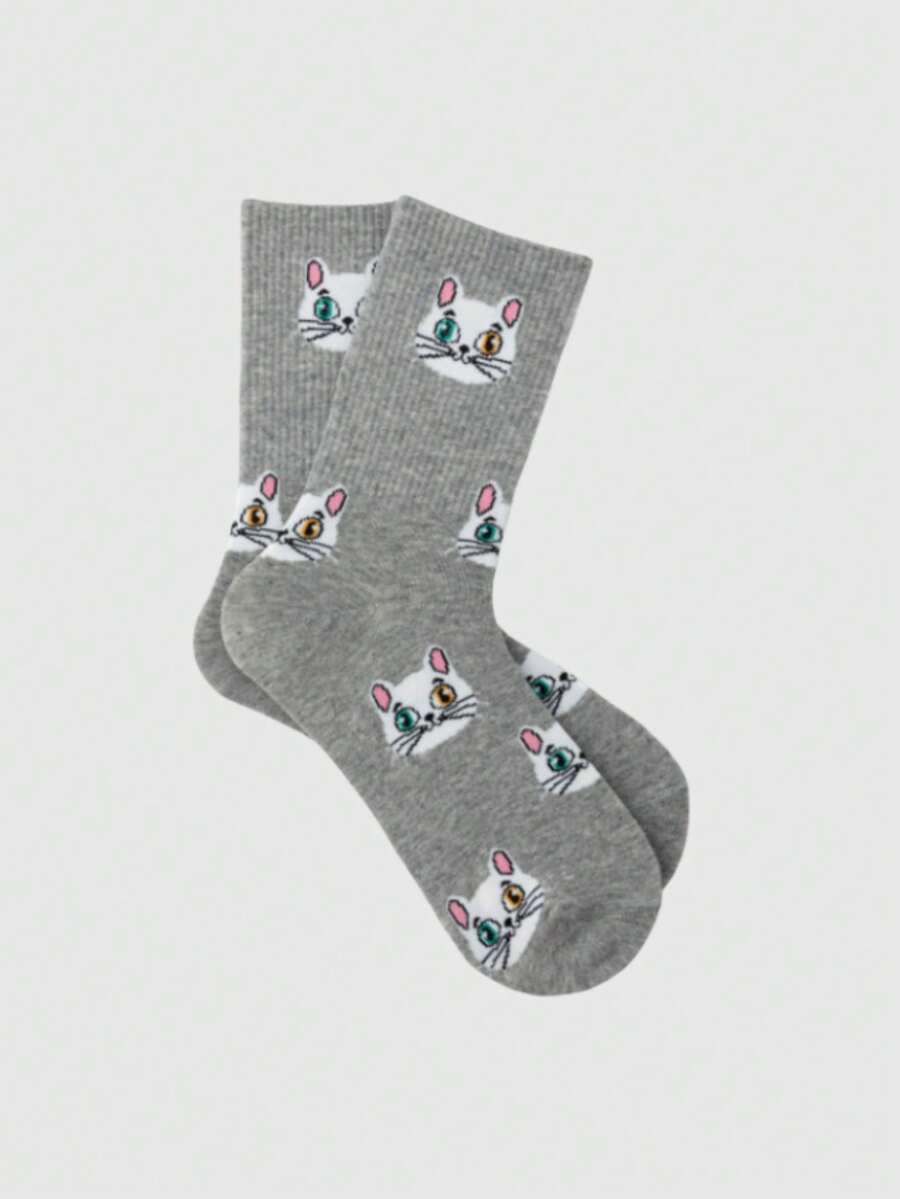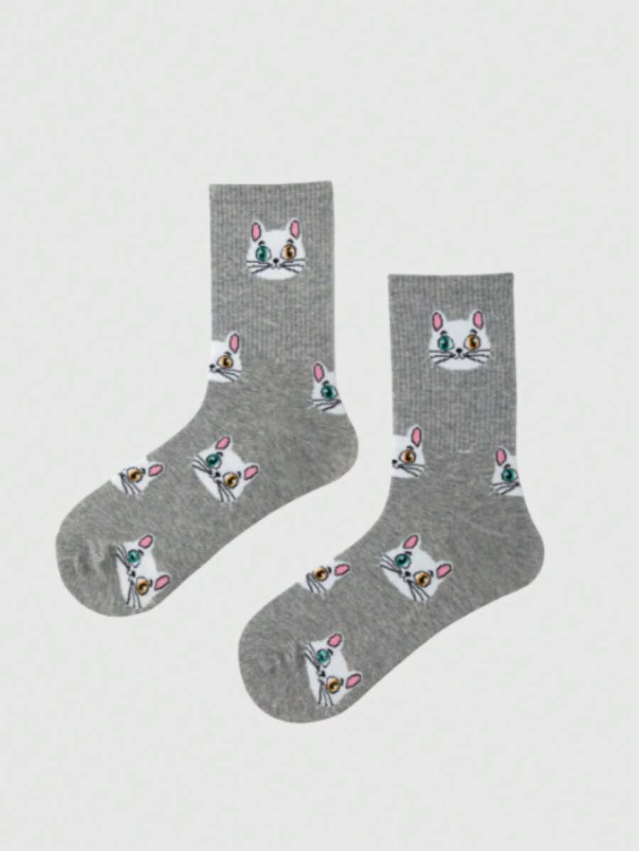 Kawaii 1 Pair Of Kitten Print Gray Women's Mid-calf Socks